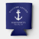 A chic modern nautical-themed can cooler for your boat's guest that features a white anchor on a navy blue background. You can personalise the "Welcome Aboard" text and your boat's name and location in elegant white typography.