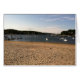 BOAT AND BEACH SCENE WITH WATER, SAND AND BLUE SKY