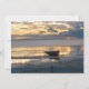 A lone Heron and an empty dinghy at low tide with the first golden rays of sunset reflected in the still pools of seawater left behind.