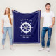 White ship steering wheel with compass rose Boat life Navy Blue and white Fleece Blanket. This blanket is dedicated to your boat with it’s name. Safe sailing and steady steering by the helm. A maritime and Classic blanket perfect for the boat, cosy up and keep warm even on those late summer night with a cool breeze. The text is Customisable, add your name of the boat on top and preferred text under like Family name, location or other. Available in different sizes and colour combinations.
