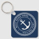 Keyring for your boat featuring a white, elegant anchor and rope emblem with your custom boat name and hailing port on a dark blue background.