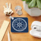 Keychain featuring a white, elegant ship's wheel and rope emblem with custom boat name and hailing port (or other custom text) on a dark blue background.