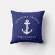 A chic modern nautical-themed outdoor pillow for your boat that features a white illustration of an anchor on a dark navy blue background. You can personalise the "Welcome Aboard" text and your boat's name and location.