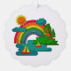Boat travel landscape under sun clouds and rainbow tree decoration card