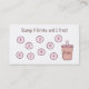 A bubble tea shop business card with a doodle of a bubble milk tea with lots of boba pearls. The tagline reads "handcrafted with love" which you can change to your shop's unique selling preposition. On the reverse is a loyalty rewards card designed in the shape of boba pearls to reward customers who buy 9 bubble teas to get 1 free drink.