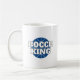 Bocce King funny coffee mug for Bocci player. Cool cup with blue boccie ball logo and humourous quote. Personalise with your own text and colours.
