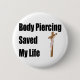This Christian design has a picture of Jesus on the cross. The saying says "Body Piercing saved my life" Image property of Diligent Heart