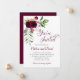 This wedding invitation features a romantic and elegant design, with a rich floral arrangement in burgundy, blush, and green adorning the top corner. The layout is clean and centered, using graceful script and serif fonts to convey a formal tone. Event details are clearly presented, including the date, time, venue, and a note about post-ceremony festivities. The overall aesthetic blends classic charm with celebratory warmth, making it suitable for a traditional church wedding followed by a joyful reception.