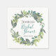 Watercolor garden foliage wreath in pretty shades of green, personalised paper napkins.