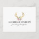 Coordinates with the Bohemian Gold Antlers with Flowers Business Card Template by 1201AM. An illustration of deer antlers in faux metallic gold is combined with a bouquet of flowers to provide a bohemian aesthetic on this personalised postcard template. Great to use for sending thank you's to customers, for announcements, personal correspondence, and more.