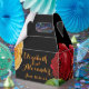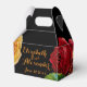 A modern bohemian wedding design on a black background with red and yellow roses creates a custom gable favour box with a template area for your names and date. By changing the text you can use the favour box for other occasions.