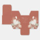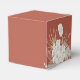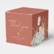 Beautiful rustic bohemian white orchid and dried botanical palm leaf arrangements, wedding favour box. Rust orange colour background, coordinating white text with graphic "Thank you" and doodle heart accent. Designed to match our Bohemian Oasis Wedding Collection.