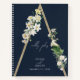 A beautiful bohemian style rustic wood pyramid with white watercolor florals cascading on the side and a blue background. A unique design that uses vintage white watercolor botanicals on a bohemian triangle structure. A charming white floral design with rustic and geometric features and elegant script typography. An elegant wedding planner notebook design with modern elements. Matching wedding invitations and other stationery items are also available.