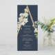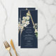 A beautiful bohemian style rustic wood pyramid with white watercolor florals cascading on the side and a blue background. A unique design that uses vintage white watercolor botanicals on a bohemian triangle structure. A charming white floral design with rustic and geometric features and elegant script typography. An elegant wedding menu card design with modern elements. Matching wedding invitations and other stationery items are also available.