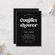 This simple and boho wedding couples shower invitation features white, retro typography on a dark black background.