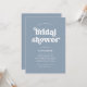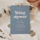 This simple and boho bridal shower invitation features white, retro typography on a dusty blue background.