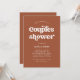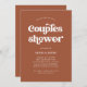 This simple and boho wedding couples shower invitation features white, retro typography on a neutral terracotta background.