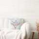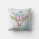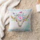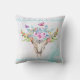 A square pillow with a turquoise and pastel watercolor background. A boho chic animal skull with a floral bouquet upon its head and little butterflies fluttering about.