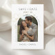 These modern minimalist wedding save the date flat cards feature a boho arch couple photo, delicate imitation gold floral elements and a contemporarty set of fonts in jet black. Flower detail is repeated at the back against a soft ivory background. This design is contemporary and chic. Perfect for the stylish and elegant couple.