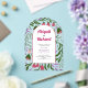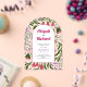 This arch shaped acrylic wedding invitation showcases a bohemian arch design embellished with retro-inspired branches and floral elements. Behind the arch there are deep greens, sage, magenta, lilac, and soft pinks flowers and leaves, all presented in a playful folklore aesthetic. The combination of these colours and the whimsical design creates a unique and enchanting invitation that perfectly captures the essence of a boho-themed celebration. The names of the couple are in bold typography.