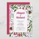 Boho arch and retro folklore branches with flowers wedding Invitation. This floral wedding invitation features a bohemian arch adorned with retro folklore branches and flowers. The design includes a mix of dark and sage green, magenta, lilac, and pink colours, all in a whimsical folklore style. The boho arch serves as the focal point and holds your text, with the retro elements adding a unique touch to the overall aesthetic. The back is of solid magenta viva colour.