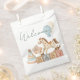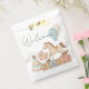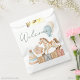 A welcome message for a white paper favour bag with a baby-themed, watercolor-style design. The front features a rocking horse, a stack of baby socks, a stacking ring toy, and a pair of balloons.