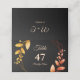 Set against a striking black background, this place card features apricot-coloured text that provides a warm and inviting touch. Delicate leaves in soft muted earth tones and earthy autumnal copper shades evoke the cosy charm of autumn, while the geometric frame in burnt orange and terracotta adds a rustic yet sophisticated flair. This place card perfectly complements your autumn-themed wedding, capturing the essence of a bohemian chic celebration. This place card radiates warmth and elegance, reflecting the romantic and modern minimalism of your special day.