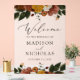 Rustic wedding welcome sign featuring watercolor flowers and greenery in muted autumnal colours of ivory, orange, mustard gold, olive green, dusty rose, and brown with a faux frosted acrylic background. "Welcome" is displayed in a modern calligraphy script with your names and wedding date shown below. Designed to coordinate with our Boho Autumn Floral wedding collection.