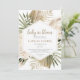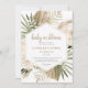 A pretty earthy boho style neutral gold frame floral watercolor baby shower invitation, featuring creamy pearl florals in creamy colours with touches of green, and dried palmetto leaves and eucalyptus. A pretty blend of script and serif coloured type in tan and grey pastel hues. The back of the invitation has a linen effect in a brown. Earthy rustic style. Perfect for spring and summer, desert or tropical vibe.