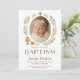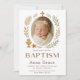 Celebrate your baby girl’s special day with this boho-style baptism invitation. Featuring a peaceful, swaddled baby framed by a delicate gold cross and botanical accents, this elegant invitation is perfect for your little one's holy occasion. Printed on high-quality material, it’s a timeless keepsake for family and friends.