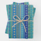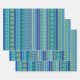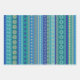 Beach design stripes pattern in blue, teal, and green with ornamental stripes of objects that include sea shells, starfish, waves, mandalas, and more for an ocean feeling with a Boho coastal vibe.