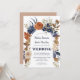 The invitation has teamed two traditional serif fonts, creating an elegant and modern look. Easily edit the template to your bride and groom names and wedding details. There is a place on the back for the bride and groom's initials (monogram). This beautiful watercolor floral wedding invitation has terracotta and rust tones with cream, beige and navy blue. These are summer flowers in earthy tones featuring a trending colour combination of blue and rust. Blue Rust Floral Boho Wedding Invitation. Font colour is Hex #2B324B.