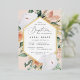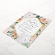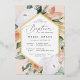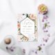 Elegant floral baptism invitation features an elongated hexagonal frame of watercolor flowers and foliage in boho desert inspired shades of peach, white, ivory, and sage green, and finished with gold foil trim. Personalise with your church baptism ceremony and party details in modern lettering.