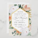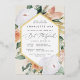 Elegant floral bat mitzvah invitation features an elongated hexagonal frame of watercolor flowers and foliage in boho desert inspired shades of peach, white, ivory, and sage green, and finished with gold foil trim. Personalise with your temple or synagogue ceremony and party details in modern lettering.