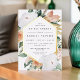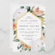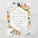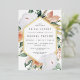 Elegant floral bridal shower invitation features an elongated hexagonal frame of watercolor flowers and foliage in boho desert inspired shades of peach, white, ivory, and sage green, and finished with gold foil trim. Personalise with your bridal shower details in modern lettering.