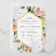 Elegant floral rehearsal dinner invitation features an elongated hexagonal frame of watercolor flowers and foliage in boho desert inspired shades of peach, white, ivory, and sage green, and finished with gold foil trim. Personalise with your wedding ceremony rehearsal and dinner details in modern lettering.