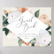Designed to match our Boho Blooms wedding collection, this elegant floral sign invites wedding guests to sign your guestbook. "Guestbook" appears in calligraphy script with your custom text; shown with "please share your wishes for the new Mr. and Mrs. [name]", framed by a geometric border of pastel watercolor flowers and botanical foliage in desert inspired earth tone shades of peach, sage green, white and ivory.