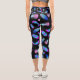 BOHO BLUE PINK FEATHER PATTERN CAPRI LEGGING, COLORFUL BRIGHT GRADIENT BLUE PINK FEATHER FALLING ON BLACK BACKGROUND