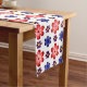 This table runner features a beautiful colorful floral pattern of blue, purple and red stylized daisies against a white background; perfect for adding a touch of retro cuteness to your dining room or kitchen.