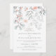 This delicate botanical wedding invitation design features shades of coral, peach, grey and blue grey, and has plenty of leaves, flowers, and accents.