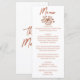 A colorful retro funky modern burnt orange floral bouquet wedding dinner menu. Which features chic template design of boho vintage white background on the front and back. With terracotta orange whimsical typography. Perfect and matching with the whole suite.
