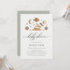 Bohemian chic illustrated bunny, moons, stars and planet, celestial theme baby shower invitation. Elegant typography design style template with coordinating rustic sage green colour backgrounds.