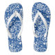 Bright and modern flip-flops printed with a stylish bo-ho chic pattern of paisley swirls and flowers. Cool beachy classic blue and white pattern.