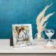 Photo plaque featuring a modern boho chic design in dusty blue and gold with your custom photo. A beautiful keepsake for an engagement, wedding or anniversary and customisable for other situations.