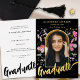 Celebrate your daughter’s college graduation with this stunning Modern Gold Foil Script Calligraphy graduate Photo arch graduation announcement card. Designed by artist Catherine Sweetman, this card features elegant gold foil calligraphy and a whimsical watercolor wildflower arch, capturing the spirit of the occasion. The front showcases your daughter’s name and graduation details in stylish gold. Foil script on a black background, while the back provides space for additional information in modern stylish typography. With an easy-to-use photo template, you can personalise the card with a cherished photo of your graduate. This unique, original design is the perfect way to commemorate her achievement and share the joy with friends and family.