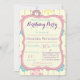 A very girly and classy boho chic (or bohemian) geometric retro floral pattern in spring time shades of pink, cream, blue and green, with flowers, hearts, and some chevron zigzags. featured on a customisable birthday invitation