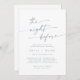This boho chic slate blue rehearsal dinner invitation is perfect for a minimalist night before wedding rehearsal. The pale dusty blue and white modern bohemian design features simple rustic calligraphy with a unique yet classic style.