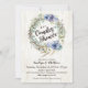 Rustic bohemian couples shower invitation card design with succulents, eucalyptus leaves, ranunculus flowers, and twigs wreath over white washed wood planks background and monogram.