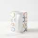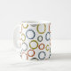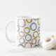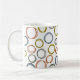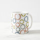 This mug has a Boho design of overlapping circles on retro shades of green, brown, blue and grey.