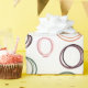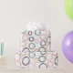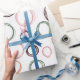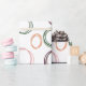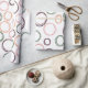 This wrapping paper has a Boho design of overlapping circles on retro pink, purple, moss green, and caramel orange.